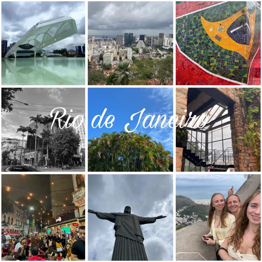 Verder gaan we in Rio naar een cultureel centrum, ontzettend gaaf gebouw met een mooi uitzicht, 360 graden over de stad. Maar wat zeker niet mag missen bij een bezoek aan Rio is het grote Jezusbeeld. Indrukwekkend, want vanuit hier heb je een nog veel mooier uitzicht over Rio. Ook bezoeken we het Museum do Amenha (“de keuzes die wij maken zijn van invloed op onze toekomst”, er wordt aandacht gevraagd voor het natuurbehoud) en de beroemde gekleurde trappen van de wijk Lapa. En we sluiten af met een echte Braziliaanse maaltijd met rijst, bruine bonen en vlees. Zina heeft een mooie fotocollage gemaakt: